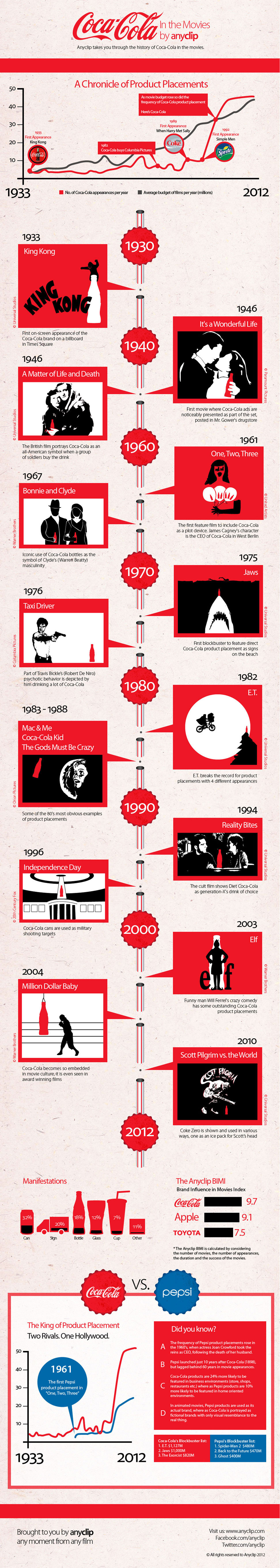 Here is an excellent infographic from the video content monetization website called Anyclip that is full of information about the Coca Cola brand being featured in popular movies. The infographic starts of by providing the number of Coca Cola appearances a year and then goes on to a timeline from 1930 to 2012 with information about some of the top films that Coca Cola has been featured in as well as a comparison to Pepsi at the end.